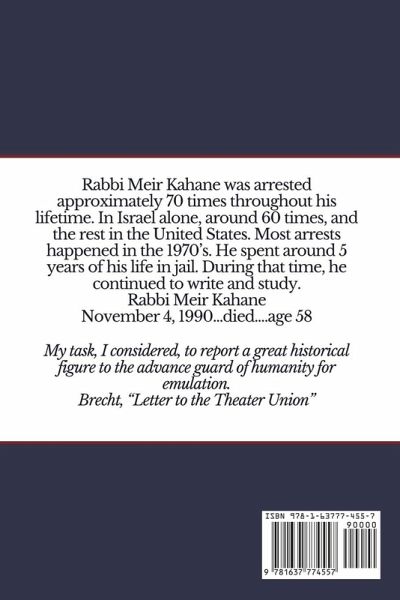 Rabbi Meir Kahane was arrested approximately 70 times throughout his lifetime. In Israel alone, around 60 times, and the rest in the United States. Most arrests happened in the 1970's. He spent around 5 years of his life in jail. During that time, he continued to write and study. Rabbi Meir Kahane November 4, 1990...died....age 58 My task, I considered, to report a great historical figure to the advance guard of humanity for emulation. Brecht, "Letter to the Theater Union"