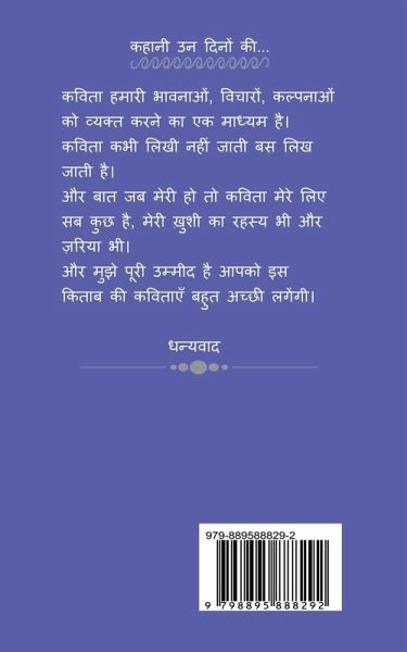 "kahani un dino ki" ek bhavnatmak aur prernadayak kavita sangrah hai, jisme shalini ne jivan ke vividh rango ko sabdo me piroya hai.is pustak me prem, dard, aasha, aur prakriti ki sundarta ka gahrai se chitran kiya gaya hai. lekhika ne saral gahanbhasa ka prayog karte huye pathako ke man me chhap chhorne vali kavitaye rachi hai. pratayek kavita ek nai kahani kehti hai, jisme vyaktigat anubhav aur samayik muddo ka samavesh hai. is sangrah me paathak ko milega: bhavnao ka samundar: pratayek kavita me lekhika ki antaratma ki aawaj sunai deti hai. prakriti ki chhavi: kavitao me prakriti drishyo ka adbhut varnan kiya gaya hai, jo pathako ko ek nai dhrasti pradan karti hai. samvedanshilta: jivan ki jatiltao aur saraltao ko ek sath sameta gaya hai, jisse har pathak ko khud se jurav mehsus hoga. yah pustak na keval kavya premiyo ke liye, balki un sabhi ke liye hai jo jivan ki gehraiyo me utarna chahte ha."kahani un dino ki"ek aesi yatra hai jo har sabd ke sath dil ki gehraiyo ko chhune ka prayash karti hai.