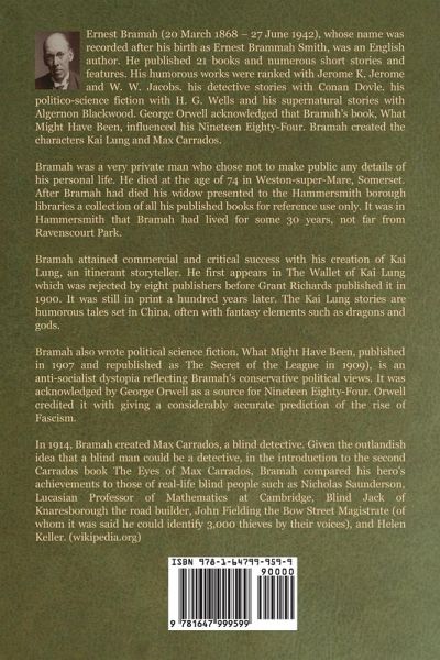 Ernest Brammah Smith wrote under the name Ernest Bramah from March 20, 1868, until June 27, 1942. He was an English poet. He wrote 21 books and a lot of short stories and articles. Many people put his funny writing up there with that of Jerome K. Jerome and W. W. Jacobs. They also put his mystery stories up there with Conan Doyle, his political science fiction with H. G. Wells, and his supernatural stories with Algernon Blackwood. George Orwell said that What Might Have Been by Bramah had an effect on his book Nineteen Eighty-Four. Kai Lung and Max Carrados are characters that Bramah made up. Eric Ernest Brammah Smith was born in Manchester, England, in 1868. His middle name was spelled 'Brammah' instead of 'Bramah' on his birth certificate. He was the son of Charles Clement Smith and Susannah (Brammah) Smith. He quit Manchester Grammar School when he was 16 because he was near the bottom in every class. He learned how to be a farmer and then did it on his own. His father helped him with money. In a short time, he went from working in a workplace to being very rich.