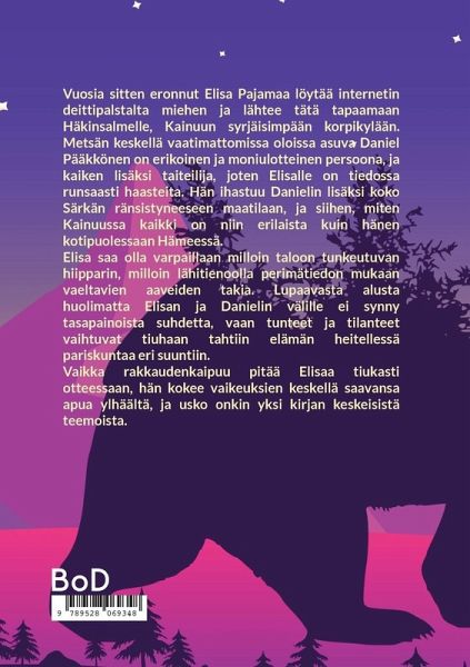 Vuosia sitten eronnut Elisa Pajamaa löytää internetin deittipalstalta miehen ja lähtee tätä tapaamaan Häkinsalmelle, Kainuun syrjäisimpään korpikylään. Metsän keskellä vaatimattomissa oloissa asuva Daniel Pääkkönen on erikoinen ja moniulotteinen persoona, ja kaiken lisäksi taiteilija, joten Elisalle on tiedossa runsaasti haasteita. Hän ihastuu Danielin lisäksi koko Särkän ränsistyneeseen maatilaan, ja siihen, miten Kainuussa kaikki on niin erilaista kuin hänen kotipuolessaan Hämeessä. Elisa saa olla varpaillaan milloin taloon tunkeutuvan hiipparin, milloin lähitienoolla perimätiedon mukaan vaeltavien aaveiden takia. Lupaavasta alusta huolimatta Elisan ja Danielin välille ei synny tasapainoista suhdetta, vaan tunteet ja tilanteet vaihtuvat tiuhaan tahtiin elämän heitellessä pariskuntaa eri suuntiin. Vaikka rakkaudenkaipuu pitää Elisaa tiukasti otteessaan, hän kokee vaikeuksien keskellä saavansa apua ylhäältä, ja usko onkin yksi kirjan keskeisistä teemoista.