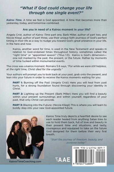 "What if God could change your life through one single event?" Kairos Time. A time we feel is God appointed. A time that becomes more than yesterday, today, and tomorrow combined. Are you in need of a Kairos moment in your life? Angela Crist, author of Kairos Time part one, Barb Miller, author of part two, and Niccie Kliegl, author of part three, use their unique faith journeys of God's perfect timing in their life as a way to nudge you toward God's great presence in your life, in the here and now. Kairos, another word for time, is used in the New Testament and speaks in relation to God-ordained times throughout history, sometimes called the "right time" or "appointed season" (Titus 1:3). Kairos is God's dimension-one not marked by the past, the present, or the future. Rather by moments of time tucked within monumental events. The cross was a kairos moment. Romans 5:6 says, "For while we were still helpless, at the right time, Christ died for the ungodly." Your authors will prompt you to look back at your past, grab onto the present, and lean into your future in order to receive the Kairos moments waiting for you: PART 1: Burning off the Past (Angela Crist) Here you will heal from past hurts, for a strong foundation found through discovering your identity in Christ. PART 2: Lighting up the Present (Barb Miller) Here you will find a beauty within your present surroundings and within yourself, regardless of your past, that only Christ can provide. PART 3: Blazing into the Future: (Niccie Kliegl) This is where you will learn to boldly step into your new God-appointed future. Kairos Time truly depicts a heartfelt desire to see each reader healed from anything Satan tries to use to hold them back, full of love and beauty in their present time and situations, and lastly, courageous and equipped to take on the future God designed for them before their very first breath. "Start the journey of freedom, beauty, and purpose today!"