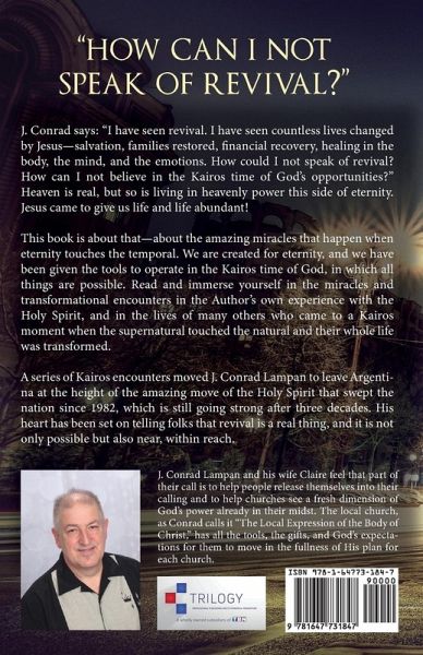"How can I not speak of revival?" J. Conrad says: "I have seen revival. I have seen countless lives changed by Jesus--salvation, families restored, financial recovery, healing in the body, the mind, and the emotions. How could I not speak of revival? How can I not believe in the Kairos time of God's opportunities?" Heaven is real, but so is living in heavenly power this side of eternity. Jesus came to give us life and life abundant! This book is about that--about the amazing miracles that happen when eternity touches the temporal. We are created for eternity, and we have been given the tools to operate in the Kairos time of God, in which all things are possible. Read and immerse yourself in the miracles and transformational encounters in the Author's own experience with the Holy Spirit, and in the lives of many others who came to a Kairos moment when the supernatural touched the natural and their whole life was transformed. A series of Kairos encounters moved J. Conrad Lampan to leave Argentina at the height of the amazing move of the Holy Spirit that swept the nation since 1982, which is still going strong after three decades. His heart has been set on telling folks that revival is a real thing, and it is not only possible but also near, within reach.