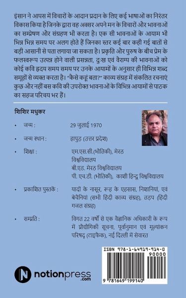Man has continuously developed several languages to communicate and document various thoughts and feelings those frequently come to his mind. The dimensions of such feelings may, however, differ at different occasions reflection of which can be easily identified from the said words. The difference in the poetic work of any writer on the same subject most of the times is achieved due to these dimensions. The current book "Kaise Kahun Bata ?" is nothing but a display of the different dimension of the joy, sorrow and recluseness feelings emanating from the deep passion of love.
