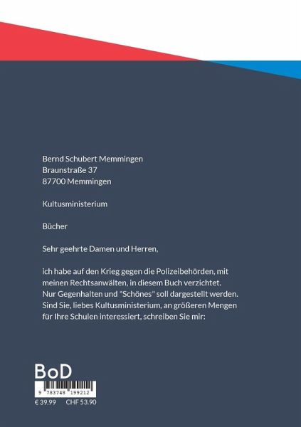 Bernd Schubert MemmingenBraunstraße 3787700 MemmingenKultusministeriumBücherSehr geehrte Damen und Herren,ich habe auf den Krieg gegen die Polizeibehörden, mitmeinen Rechtsanwälten, in diesem Buch verzichtet.Nur Gegenhalten und "Schönes" soll dargestellt werden.Sind Sie, liebes Kultusministerium, an größeren Mengenfür Ihre Schulen interessiert, schreiben Sie mir: