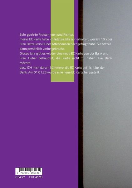 Sehr geehrte Richterinnen und Richter,meine EC Karte habe ich letztes Jahr nur erhalten, weil ich 10 x beiFrau Betreuerin Huber Attenhausen nachgefragt habe. Sie hat sie dann persönlich vorbeigebracht.Dieses Jahr gibt es wieder eine neue EC Karte von der Bank und Frau Huber behauptet, die Karte nicht zu haben. Die Bank möchte,dass ICH mich darum kümmere, die EC Karte sei nicht bei der Bank. Am 01.01.23 wurde eine neue EC Karte hergestellt.