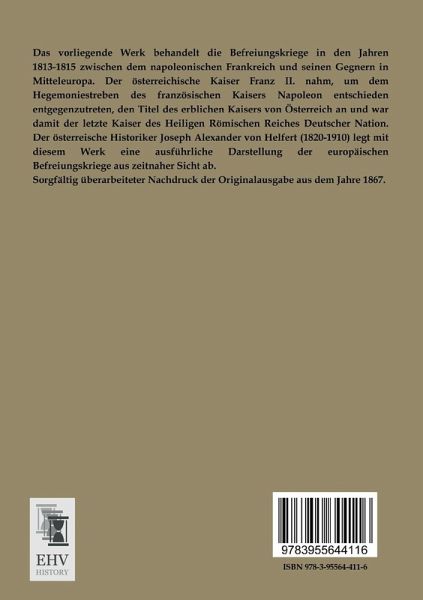Das vorliegende Werk behandelt die Befreiungskriege in den Jahren 1813-1815 zwischen dem napoleonischen Frankreich und seinen Gegnern in Mitteleuropa. Der österreichische Kaiser Franz II. nahm, um dem Hegemoniestreben des französischen Kaisers Napoleon entschieden entgegenzutreten, den Titel des erblichen Kaisers von Österreich an und war damit der letzte Kaiser des Heiligen Römischen Reiches Deutscher Nation. Der österreische Historiker Joseph Alexander von Helfert (1820-1910) legt mit diesem Werk eine ausführliche Darstellung der europäischen Befreiungskriege aus zeitnaher Sicht ab.