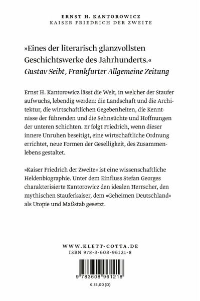 Ernst H. Kantorowicz beschreibt die Landschaft und die Architektur, die wirtschaftlichen Gegebenheiten, die Kenntnisse der führenden und die Sehnsüchte und Hoffnungen der unteren Schichten. Er folgt Friedrich, wenn dieser innere Unruhen beseitigt, eine wirtschaftliche Ordnung errichtet, neue Formen des Zusammenlebens gestaltet.