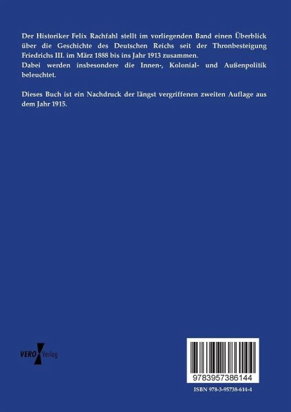 Der Historiker Felix Rachfahl stellt im vorliegenden Band einen Überblick über die Geschichte des Deutschen Reichs seit der Thronbesteigung Friedrichs III. im März 1888 bis ins Jahr 1913 zusammen.