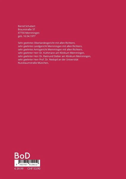 Bernd SchubertBraunstraße 3787700 Memmingengeb. 16.04.1977Sehr geehrtes Oberlandesgericht mit allen Richtern,sehr geehrtes Landgericht Memmingen mit allen Richtern,sehr geehrtes Amtsgericht Memmingen mit allen Richtern,sehr geehrter Herr Dr. Küthmann am Klinikum Memmingen,sehr geehrter Herr Dr. Raimund Steber am Klinikum Memmingen,sehr geehrter Herr Prof. Dr. Nedopil an der Universität Nussbaumstraße München,Sehr geehrte Damen und Herren in den deutschen Gerichten,sehr geehrte Parteien in Deutschland,sehr geehrtes Klinikum Memmingen mit allen Ärzten,heute Abend habe ich eine Pizza bei Da Enzo in Memmingen telefonisch bestellt. Der Pizzafahrer kam in die Erfurter Straße 81 in Memmingen, mein Elternhaus.Meine Mutter öffnete die Haustür und sagte zum Pizzafahrer: "MeinSohn ist geistig nicht fit, ich nehme die Pizza nicht für meinen Sohn an."