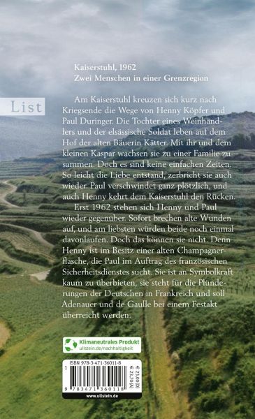 Am Kaiserstuhl kreuzen sich kurz nach Kriegsende die Wege von Henny Köpfer und Paul Duringer. Die Tochter eines Weinhändlers und der elsässische Soldat leben auf dem Hof der alten Bäuerin Kätter. Mit ihr und dem kleinen Kaspar wachsen sie zu einer Familie zusammen. Doch es sind keine einfachen Zeiten. So leicht die Liebe entsteht, zerbricht sie auch wieder. Erst 1962 stehen sich Henny und Paul wieder gegenüber: Henny ist im Besitz einer alten Champagnerflasche, die Paul im Auftrag des französischen Sicherheitsdienstes sucht. An…mehr