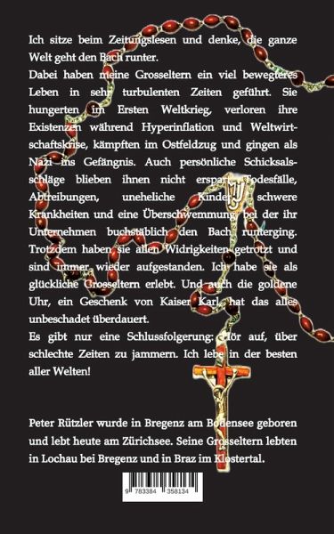Ich sitze beim Zeitungslesen und denke, die ganze Welt geht den Bach runter.Dabei haben meine Grosseltern ein viel bewegteres Leben in sehr turbulenten Zeiten geführt. Sie hungerten im Ersten Weltkrieg, verloren ihre Existenzen während Hyperinflation und Weltwirtschaftskrise, kämpften im Ostfeldzug und gingen als Nazi ins Gefängnis. Auch persönliche Schicksalsschläge blieben ihnen nicht erspart: Todesfälle, Abtreibungen, uneheliche Kinder, schwere Krankheiten und eine Überschwemmung, bei der ihr Unternehmen buchstäblich den Bach runterging. Trotzdem haben sie allen Widrigkeiten getrotzt und sind immer wieder aufgestanden. Ich habe sie als glückliche Grosseltern erlebt. Und auch die goldene Uhr, ein Geschenk von Kaiser Karl, hat das alles unbeschadet überdauert.Es gibt nur eine Schlussfolgerung: Hör auf, über schlechte Zeiten zu jammern. Ich lebe in der besten aller Welten!