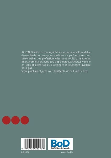 KAIZEN. Derrière ce mot mystérieux, se cache une formidable démarche de bon sens pour améliorer vos performances, tant personnelles que professionnelles. Vous voulez atteindre un objectif ambitieux, peut-être trop ambitieux? Alors, divisez-le en sous-objectifs faciles à atteindre et réussissez; avancez pas à pas.