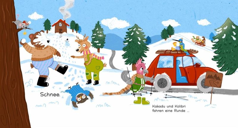 In diesem lustigen Pappbilderbuch gibt es so viel zu entdecken! Denn alle Tiere sind schwer beschäftigt: Eule, Bär und Reh machen sich bereit für eine Schneeballschlacht. Kakadu und Kolibri fahren Ski. Und Wildschwein, Fuchs und Vogel Strauß machen Pause auf der Berghütte. Auf wen sie dort wohl warten? Errätst du, wen Erdmännchen und Graugans schmücken? Und worauf bereiten sich Känguru und Krokodil vor? Blättere um und rätsle mit!