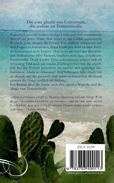 Die eine glaubt ans Universum, die andere an Tomatensoße.Eigentlich sind die bodenständige Linda und ihre exzentrische Mutter ein gutes Team. Nur wenn es um Lindas sizilianische Wurzeln geht, fliegen die Fetzen. Um endlich Antworten auf ihre Fragen zu bekommen, fliegt Linda mit ihrer kleinen Tochter kurzerhand nach Sizilien. Dort lernt sie nicht nur den schönen Bademeister Silvo kennen, sondern auch ihre sizilianische Großfamilie. Doch Lindas Vater aufzuspüren, erweist sich als schwierig. Und auch um Lindas Zwillingsschwester, die angeblich bei der Geburt gestorben ist, ranken sich gruselige Geheimnisse.Linda ist überzeugt: Ihre Schwester lebt. Doch was ist damals mit ihr passiert? Auf einer sizilianischen Hochzeit geraten die Dinge endlich ins Rollen.Ein Roman über die Suche nach den eigenen Wurzeln und die Magie von Tomatensoße."Anna Castronovo schafft es, Mystery, Spannung und jede Menge Witz in einer fesselnden Geschichte zu vereinen - und das mit einer solchen Leichtigkeit, dass man trotz der ernsten Themen immer wieder schmunzeln muss." (Sabine Müller)