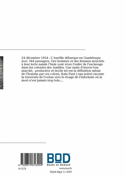 24 décembre 1854 : L¿Aurélie débarque en Guadeloupe avec 344 passagers. Des hommes et des femmes arrachés à leur terre natale l¿Inde vont vivre l¿enfer de l¿esclavage dans les colonies des Antilles. Une main d¿¿uvre bon marché productive et docile tel est la définition même de l¿homme par ces colons. Kala Pani ( eau noire) raconte la traversée de l¿océan vers le rivage de l¿infortune où la mort n¿est jamais trop loin¿.