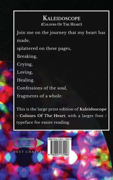 Join me on the journey that my heart has made, splattered on these pages, Breaking, Crying, Loving, Healing. Confessions of the soul, fragments of a whole. This is the large print edition of Kaleidoscope - Colours Of The Heart, with a larger font / typeface for easier reading.