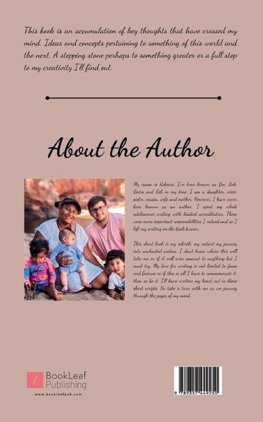 My name is Rebecca. I've been known as Bec, Bek, Becca and Reb in my time. I am a daughter, niece, sister, cousin, wife and mother. However, I have never been known as an author. I spent my whole adolescence writing with limited accreditation. There were more important responsibilities I valued and so I left my writing on the back burner. This short book is my rebirth, my restart my journey into uncharted waters. I don't know where this will take me or if it will even amount to anything but I must try. My love for writing is not limited to fame and fortune so if this is all I have to commemorate it, then so be it. I'll have written my heart out in these short scripts. So take a turn with me as we journey through the pages of my mind.