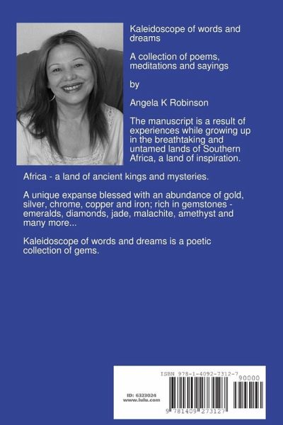 Kaleidoscope of words and dreams - A collection of poems, meditations and sayings by Angela K Robinson. The manuscript is a result of experiences while growing up in the breathtaking and untamed lands of Southern Africa, a land of inspiration. A land of ancient kings and mysteries. A unique expanse blessed with an abundance of gold, silver, chrome, copper and iron; rich in gemstones - emeralds, diamonds, jade, malachite, amethyst and many more... Kaleidoscope of words and dreams is a collection of poetic treasure.