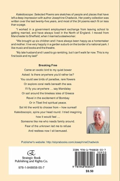 Kaleidoscope: Selected Poems are sketches of people and places that have left a deep impression with author Josephine Chadwick. Her poetry collection was written over the last twenty-five years, and most of the 24 poems each fit on less than a page. "I worked in a government employment exchange from leaving school to getting married, and have always lived in the North of England. I moved from Manchester to Sheffield, when I married a steelworker. "We brought up six children and I have always been happy as a homemaker and mother. I live very happily in a garden suburb on the border of a national park. I like music and books and the theatre. "My late husband and I used to go rambling, but I can't walk far now. This is my first book and my last!" Breaking Free Came an exotic bird to my quiet bower Asked: Is there anywhere you'd rather be? You could see birds of paradise, rare flowers Or explore coral reefs beneath the sea. I'll fly you anywhere … say Mandalay Or sail around the timeless isles of Greece Revel in the excitement of Bombay Or in Tibet find spiritual peace. So! All the world to choose from - how surreal! Kaleidoscopic, spins your head round. I tried imagining how it would feel … Someone like me who needs family around. Fear of the unknown led me to refuse And restless now I sit bemused.