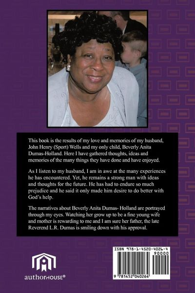 This book is the result of my love and memoirs of my only daughter Beverly and my husband, John Henry Wells. Here I have gathered thoughts, ideas and memories of which they have done and enjoyed them. As I listen to my husband, I am in awe of the many experiences he has encountered. Yet, he remains a strong man with ideas and thoughts for the future. He has had to endure so much prejudice and encounters that he said only made him desire to do better things he was experience at the time with God's help.
