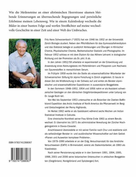 Fritz Hans Schwarzenbach (1925) hat von 1946 bis 1952 an der Universität Zürich Biologie studiert. Neben den Pflichtfächern für das Gymnasiallehrerdiplom und das Doktorat belegte er zusätzlich Vorlesungen und Übungen in Klinischer Chemie, Physikalischer Chemie, Mathematischer Statistik und Photographie. Im Februar 1952 schloss er mit dem Diplom für das Höhere Lehramt in biologischer Richtung und der Promotion als Dr. phil. II ab. In den Jahren 1952/59 arbeitete er experimentell an der Entwicklung und Anwendung eines Keimungstests mit Pollenkörnern und Pilzsporen zum Nachweis von Spurenstoffen in menschlichem Serum. Im Frühjahr 1959 wurde ihm die Stelle als wissenschaftlicher Mitarbeiter der Schweizerischen Stiftung für alpine Forschung in Zürich angeboten. Er baute in dieser Zeit die Wildforschung in der Schweiz auf und wirkte als Berater alpinistischer und wissenschaftlicher Expeditionen in außeralpine Berggebiete. In den Sommern 19348-1952, 1954 und 1956 nahm er als Assistent schweizerischer Geologen an den dänischen Ostgrönlandexpeditionen unter Leitung von Dr. Lauge Koch teil. Von Mai bis September 1953 untersuchte er als Botaniker der Zweiten Baffin Island Expedition des Arctic Institute of North America die Pflanzenwelt im Berg- und Gletschergebiet der Penny Highlands. Im Herbst 1962 weilte er als Gastdozent während sechs Wochen am Indian Statistical Institute in Calcutta. Eine chronische Krankheit seiner Frau führte Ende 1963 zu einem Berufswechsel: Er übernahm bis 1971 die administrative Verwaltung der Zürcher Hochgebirgsklinik in Davos-Clavadel. Anschließend übersiedelte er mit seiner Familie nach Chur und etablierte sich als selbständiger Berater in- und ausländischer Wissenschaftler auf dem Gebiet "Planen und Auswerten komplexer Probleme". Von 1979 - 1990 arbeitete er an der Eidg. Versuchsanstalt für das forstliche Versuchswesen (EAFV) in Birmensdorf , vorerst als Stabsmitarbeiter, ab 1983 als Vizedirektor. Nach seiner Pensionierung setzt er in den Sommern 1991, 1994, 1995, 1998, 2001 und 2006 seine botanischen Untersuchen in arktischen Berggebieten (Ostgrönland, Nordgrönland und Spitzbergen) fort.