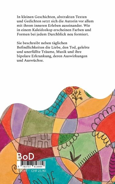 In kleinen Geschichten, abstrakten Texten und Gedichten setzt sich die Autorin vor allem mit ihrem inneren Erleben auseinander. Wie in einem Kaleidoskop erscheinen Farben und Formen bei jedem Durchblick neu formiert.Sie beschreibt neben täglichen Befindlichkeiten die Liebe, den Tod, gelebte und unerfüllte Träume, Musik und ihre bipolare Erkrankung, deren Auswirkungen und Auswüchse.