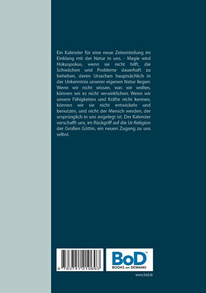 Ein Kalender für eine neue Zeiteinteilung im Einklang mit der Natur in uns. - Magie wird Hokuspokus, wenn sie nicht hilft, die Schwächen und Probleme dauerhaft zu beheben, deren Ursachen hauptsächlich in der Unkenntnis unserer eigenen Natur liegen: Wenn wir nicht wissen, was wir wollen, können wir es nicht verwirklichen. Wenn wir unsere Fähigkeiten und Kräfte nicht kennen, können wir sie nicht entwickeln und benutzen, und nicht der Mensch werden, der ursprünglich in uns angelegt ist. Der Kalender verschafft uns, im Rückgriff auf die Ur-Religion der Großen Göttin, ein neuen Zugang zu uns selbst.