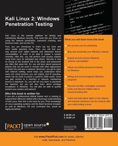 Kali Linux: a complete pentesting toolkit facilitating smooth backtracking for working hackers Key Features Conduct network testing, surveillance, pen testing and forensics on MS Windows using Kali Linux Footprint, monitor, and audit your network and investigate any ongoing infestations Customize Kali Linux with this professional guide so it becomes your pen testing toolkit Book Description Microsoft Windows is one of the two most common OS and managing its security has spawned the discipline of IT security. Kali Linux is the premier platform for testing and maintaining Windows security. Kali is built on the Debian distribution of Linux and shares the legendary stability of that OS. This lets you focus on using the network penetration, password cracking, forensics tools and not the OS. This book has the most advanced tools and techniques to reproduce the methods used by sophisticated hackers to make you an expert in Kali Linux penetration testing. First, you are introduced to Kali's top ten tools and other useful reporting tools. Then, you will find your way around your target network and determine known vulnerabilities to be able to exploit a system remotely. Next, you will prove that the vulnerabilities you have found are real and exploitable. You will learn to use tools in seven categories of exploitation tools. Further, you perform web access exploits using tools like websploit and more. Security is only as strong as the weakest link in the chain. Passwords are often that weak link. Thus, you learn about password attacks that can be used in concert with other approaches to break into and own a network. Moreover, you come to terms with network sniffing, which helps you understand which users are using services you can exploit, and IP spoofing, which can be used to poison a system's DNS cache. Once you gain access to a machine or network, maintaining access is important. Thus, you not only learn penetrating in the machine you also learn Windows privilege's escalations. With easy to follow step-by-step instructions and support images, you will be able to quickly pen test your system and network. What you will learn Set up Kali Linux for pen testing Map and enumerate your Windows network Exploit several common Windows network vulnerabilities Attack and defeat password schemes on Windows Debug and reverse-engineer Windows programs Recover lost files, investigate successful hacks and discover hidden data in innocent-looking files Catch and hold admin rights on the network, and maintain backdoors on the network after your initial testing is done