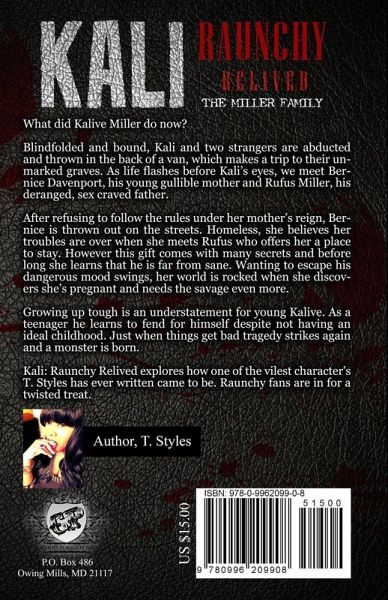 What did Kalive Miller do now? Blindfolded and bound, Kali and two strangers are abducted and thrown in the back of a van, which makes a trip to their unmarked graves. As life flashes before Kali's eyes, we meet Bernice Davenport, his young gullible mother and Rufus Miller, his deranged, sex craved father. After refusing to follow the rules under her mother's reign, Bernice is thrown out on the streets. Homeless, she believes her troubles are over when she meets Rufus who offers her a place to stay. However this gift comes with many secrets and before long she learns that he is far from sane. Wanting to escape his dangerous mood swings, her world is rocked when she discovers she's pregnant and needs the savage even more. Growing up tough is an understatement for young Kalive. As a teenager he learns to fend for himself despite not having an ideal childhood. Just when things get bad tragedy strikes again and a monster is born. Kali: Raunchy Relived explores how one of the vilest character's T. Styles has ever written came to be. Raunchy fans are in for a twisted treat.