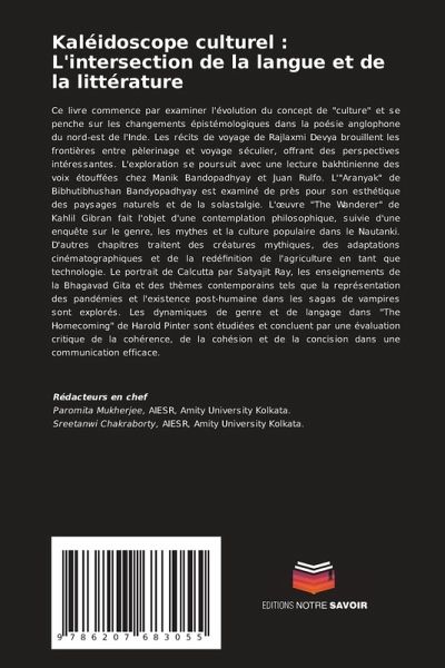 Ce livre commence par examiner l'évolution du concept de "culture" et se penche sur les changements épistémologiques dans la poésie anglophone du nord-est de l'Inde. Les récits de voyage de Rajlaxmi Devya brouillent les frontières entre pèlerinage et voyage séculier, offrant des perspectives intéressantes. L'exploration se poursuit avec une lecture bakhtinienne des voix étouffées chez Manik Bandopadhyay et Juan Rulfo. L'"Aranyak" de Bibhutibhushan Bandyopadhyay est examiné de près pour son esthétique des paysages naturels et de la solastalgie. L'oeuvre "The Wanderer" de Kahlil Gibran fait l'objet d'une contemplation philosophique, suivie d'une enquête sur le genre, les mythes et la culture populaire dans le Nautanki. D'autres chapitres traitent des créatures mythiques, des adaptations cinématographiques et de la redéfinition de l'agriculture en tant que technologie. Le portrait de Calcutta par Satyajit Ray, les enseignements de la Bhagavad Gita et des thèmes contemporains tels que la représentation des pandémies et l'existence post-humaine dans les sagas de vampires sont explorés. Les dynamiques de genre et de langage dans "The Homecoming" de Harold Pinter sont étudiées et concluent par une évaluation critique de la cohérence, de la cohésion et de la concision dans une communication efficace.