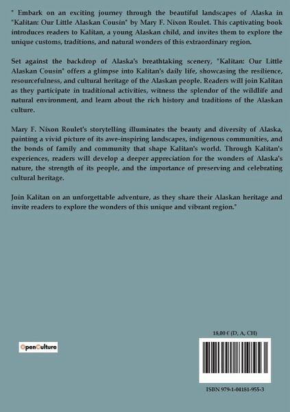 " Embark on an exciting journey through the beautiful landscapes of Alaska in "Kalitan: Our Little Alaskan Cousin" by Mary F. Nixon Roulet. This captivating book introduces readers to Kalitan, a young Alaskan child, and invites them to explore the unique customs, traditions, and natural wonders of this extraordinary region. Set against the backdrop of Alaska's breathtaking scenery, "Kalitan: Our Little Alaskan Cousin" offers a glimpse into Kalitan's daily life, showcasing the resilience, resourcefulness, and cultural heritage of the Alaskan people. Readers will join Kalitan as they participate in traditional activities, witness the splendor of the wildlife and natural environment, and learn about the rich history and traditions of the Alaskan culture. Mary F. Nixon Roulet's storytelling illuminates the beauty and diversity of Alaska, painting a vivid picture of its awe-inspiring landscapes, indigenous communities, and the bonds of family and community that shape Kalitan's world. Through Kalitan's experiences, readers will develop a deeper appreciation for the wonders of Alaska's nature, the strength of its people, and the importance of preserving and celebrating cultural heritage. Join Kalitan on an unforgettable adventure, as they share their Alaskan heritage and invite readers to explore the wonders of this unique and vibrant region."