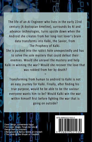 Kalki, The Shadow is a tale of a famous Hindu mythology character retold in a modern and never-before-imagined form. Set in the early 22nd century (A dystopian timeline), surrounded by Artificial Intelligence (AI) and advanced technologies, the story revolves around the main characters, Hera and Kalki. The life of Hera, an AI Engineer turns upside down when the Android she creates from her long-lost lover's brain data transforms into Kalki, the Savior, from The Prophecy of Kalki. She is pushed into the rabbit hole unexpectedly and has to solve the sole mystery that could defeat their enemies. Would she unravel the mystery and help Kalki in winning the war? Would she recover the love that was robbed from her by death? Transforming from human to android to Kalki is not an easy journey for Kalki. Finally, after finding his true purpose, would he be able to be the saviour everyone wants him to be? Would Kalki win the war within himself first before fighting the war that is going on outside? The story explores the theme of scientific advancements, the incline of humanity in the imagined future, the consequences of materialistic minds, the complexity of love and the importance of family.