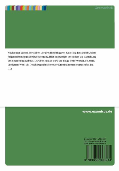 Studienarbeit aus dem Jahr 2012 im Fachbereich Germanistik - Gattungen, Note: 13, Justus-Liebig-Universität Gießen (Germanistik), Veranstaltung: Krimis für Kinder, Sprache: Deutsch, Abstract: Nach einer kurzen Vorstellen der drei Hauptfiguren Kalle, Eva-Lotta und Anders folgen narratologische Beobachtung. Hier interessiert besonders die Gestaltung des Spannungsaufbaus. Darüber hinaus wird die Frage beantwortet, ob Astrid Lindgrens Werk als Detektivgeschichte oder Kriminalroman einzustufen ist. Abschließend wird noch die Verwendung von "Kalle Blomquist" im Deutschunterricht im Hinblick auf das Alter der Kinder und Jugendlichen, die zu erwerbenden Kompetenzen sowie den Lernstand thematisiert.
