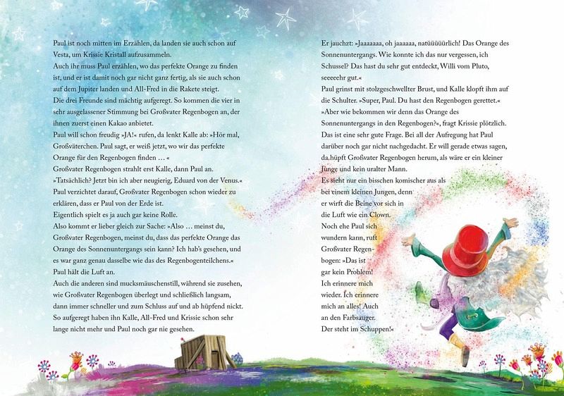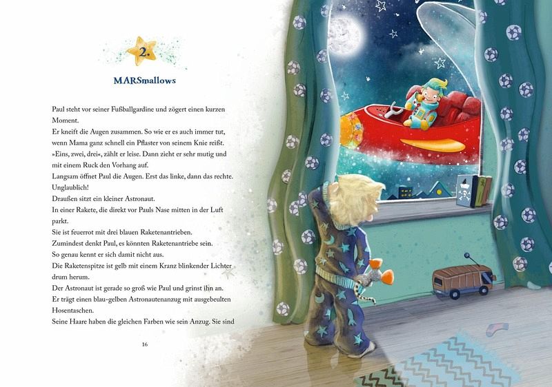 Abenteuer im Schlafanzug! "Tock, tock, tock!" Wer klopft denn da in der Nacht ans Fenster? Auf Zehenspitzen schleicht Paul durch sein Zimmer und zieht den Vorhang auf. Nicht zu glauben! Draußen schwebt der kleine Astronaut und Weltraumabenteurer Kalle Komet. In einer feuerroten Rakete. Paul ist begeistert! Natürlich möchte er mit Kalle Komet eine Runde drehen und echte MARSmallows auf dem Mars fischen. Also schnappt sich Paul seine Stoffratte Konrad und hüpft in die Rakete. Als die beiden kurz darauf vom Sternenmädchen Krissie Kristall erfahren, dass eine Sternschnuppe mitten in den Regenbogen gekracht ist, sind alle wild entschlossen zu helfen und den Regenbogen zu reparieren! * Ein kleiner Held für Kinder, die noch nicht ins Bett gehen wollen * Großes Abenteuer mit Kuschelfaktor, perfekt für Gute-Nacht-Rituale * Viele bunte Bilder und kindgerechte Spannung für Kinder ab 5 Jahren * Mehr Abenteuer gibt es in den Folgebänden "Auf ins Drachenland" und "Die FußbALL-Meisterschaft"