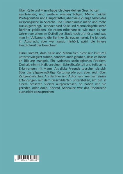 Über Kalle und Manni habe ich diese kleinen Geschichten geschrieben, und weitere werden folgen. Meine beiden Protagonisten sind Hauptstädter, aber viele Zuzüge haben das Ursprüngliche in Sprache und Binnenkultur mehr und mehr zurückgedrängt. Dennoch sind Kalle und Manni eingefleischte Berliner geblieben, sie reden miteinander, wie man es vor Jahren vor allem im Ostteil der Stadt noch oft hörte und was man im Volksmund die Berliner Schnauze nennt. Sie ist derb im Ausdruck, aber wer genau hinhört, spürt die innere Herzlichkeit der Bewohner. Hinzu kommt, dass Kalle und Manni sich nicht nur kulturell unterprivilegiert fühlen, sondern auch glauben, dass es ihnen an Bildung mangelt. Ein typisches soziologisches Problem. Deshalb nimmt Kalle an einem Schreibcafé teil und teilt seine Erfahrungen mit Manni. Als dicke Freunde tauschen sie sich über das allgegenwärtige Kulturgerede aus, aber auch über Zeitgenössisches. Als Berliner und Autor kann man mir einige Erfahrungen mit dem Geschilderten unterstellen, ich bin in einem besseren Viertel aufgewachsen, so haben wir nie geredet, oder doch, Konrad Adenauer war das Rheinische auch nicht abzusprechen.