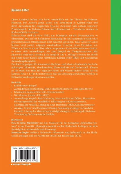 Dieses Lehrbuch befasst sich leicht verständlich mit der Theorie der Kalman-Filterung. Die Autoren geben damit eine Einführung in Kalman-Filter und deren Anwendung für eingebettete Systeme. Zusätzlich wird anhand konkreter Praxisbeispiele der Kalman-Filterentwurf demonstriert - Teilschritte werden im Buch ausführlich erläutert.Kalman-Filter sind die erste Wahl, um Störsignale auf den Sensorsignalen zu eliminieren. Dies ist von besonderer Bedeutung, da viele technische Systeme ihre prozessrelevanten Informationen über Sensoren gewinnen. Jeder Messwert eines Sensors weißt jedoch aufgrund verschiedener Ursachen einen Messfehler auf. Würde ein System nur auf Basis dieser ungenauen Sensorinformationen arbeiten, so wären viele Anwendungen, wie zum Beispiel ein Navigationssystem oder autonome arbeitende Systeme, nicht möglich.Das Buch ist geeignet für interessierte Bachelor- und Master-Studierende der Fachrichtungen Informatik, Maschinenbau, Elektrotechnik undMechatronik. Ebenso ist dasBuch eine Hilfe für Ingenieure und Wissenschaftler, die ein Kalman-Filter z. B. für die Datenfusion oder die Schätzung unbekannter Größen in Echtzeitanwendungen einsetzen möchten.