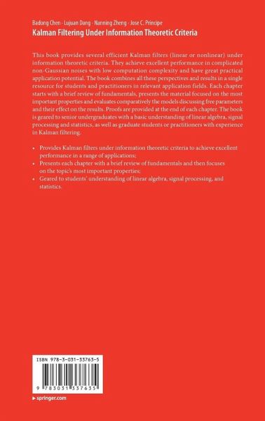 This book provides several efficient Kalman filters (linear or nonlinear) under information theoretic criteria. They achieve excellent performance in complicated non-Gaussian noises with low computation complexity and have great practical application potential. The book combines all these perspectives and results in a single resource for students and practitioners in relevant application fields. Each chapter starts with a brief review of fundamentals, presents the material focused on the most important properties and evaluates comparatively the models discussing free parameters and their effect on the results. Proofs are provided at the end of each chapter. The book is geared to senior undergraduates with a basic understanding of linear algebra, signal processing and statistics, as well as graduate students or practitioners with experience in Kalman filtering.