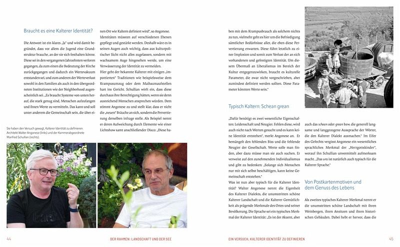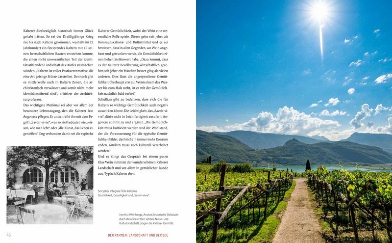 Was macht Kaltern aus? Was prägt seinen Charakter, was die Menschen, die dort leben, und was sein Gesicht? Dieses Buch macht sich auf Spurensuche. Es ist der Versuch, die Wurzeln einer der wohl bekanntesten Südtiroler Gemeinden offenzulegen und aufzuzeigen, wie die Entwicklung von Gesellschaft, Wirtschaft und Landschaft die Identität der Kalterer geformt hat. So geht es um die Landschaft und selbstverständlich um den Kalterer See (in Form von Wasser und Wein), es geht um die Geschichte des Dorfes und seiner Fraktionen, es geht aber auch um Schule, Religion und nicht zuletzt um die Kultur: um Bau- und Kunstwerke, um Flur- und Familiennamen, um die Besonderheiten der Kalterer Mundart. Weil ein Dorf nun einmal leben muss, nimmt das Buch zudem die Entwicklung des Wirtschaftsgefüges in Kaltern unter die Lupe - von Landwirtschaft und Handwerk, von Handel, Tourismus und Mobilität. Und nicht zuletzt wirft es auch einen Blick auf das Dorfleben: auf die Highlights in Gestalt der Vereine oder des Sports in Kaltern ebenso wie in die Abgründe in Form spektakulärer Verbrechen. Das Buch ist damit das Porträt eines Dorfes, das nicht ist wie alle anderen und es auch nicht sein möchte. Es ist das Porträt von Kaltern.