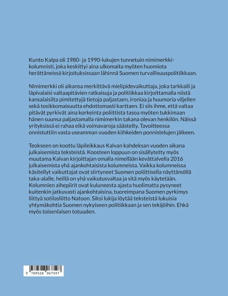 Kunto Kalpa oli 1980- ja 1990-lukujen tunnetuin nimimerkkikolumnisti, joka keskittyi aina ulkomaita myöten huomiota herättäneissä kirjoituksissaan lähinnä Suomen turvallisuuspolitiikkaan. Nimimerkki oli aikansa merkittävä mielipidevaikuttaja, joka tarkkaili ja läpivalaisi valtaapitävien ratkaisuja ja politiikkaa kirjoittamalla niistä kansalaisilta pimitettyjä tietoja paljastaen, ironiaa ja huumoria viljellen sekä tosikkomaisuutta ehdottomasti karttaen. Ei siis ihme, että valtaa pitävät pyrkivät aina korkeinta poliittista tasoa myöten tukkimaan hänen suunsa paljastamalla nimimerkin takana olevan henkilön. Näissä yrityksissä ei rahaa eikä voimavaroja säästelty. Tavoitteessa onnistuttiin vasta useamman vuoden kiihkeiden ponnistelujen jälkeen. Teokseen on koottu läpileikkaus Kalvan kahdeksan vuoden aikana julkaisemista teksteistä. Koosteen loppuun on sisällytetty myös muutama Kalvan kirjoittajan omalla nimellään kevättalvella 2016 julkaisemista yhä ajankohtaisista kolumneista. Vaikka kolumneissa käsitellyt vaikuttajat ovat siirtyneet Suomen poliittisella näyttämöllä taka-alalle, heillä on yhä vaikutusvaltaa ja sitä myös käytetään. Kolumnien aihepiirit ovat kuluneesta ajasta huolimatta pysyneet kuitenkin jatkuvasti ajankohtaisina, tuoreimpana Suomen pyrkimys liittyä sotilasliitto Natoon. Siksi lukija löytää teksteistä lukuisia yhtymäkohtia Suomen nykyiseen politiikkaan ja sen tekijöihin. Ehkä myös toisenlaisen totuuden.