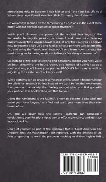 Introducing How to Become a Sex Master and Take Your Sex Life to a Whole New Level Even if Your Sex Life is Currently Non-Existent! Do you always seem to do the same boring 3 positions, in the exact same order, without any real passion or spark anymore? Inside you’ll discover the power of the ancient teachings of the Kamasutra to reignite passion, excitement and have mind blowing orgasms every time you get down to it. Not only that, but you’ll discover how to become a Sex God and fulfil all of your partners wildest dreams. So, instead of the bed squeaking and occasional moans you hear, you’ll be both screaming the house down, and instead of seeing sex as a routine chore, you’ll leave your partner BEGGING for more, as well as reigniting the excitement back in yourself. Using the Kamasutra is the ULTIMATE way to become a Sex God and make your lover beyond satisfied and want you more than they ever have before. Oh, and we cover how the Tantric Teachings can completely revolutionise your Relationship as well as offer more variety and intimacy in your love life. Don’t let yourself be part of the epidemic that is ‘Great American Sex Drought’ that the Washington Post reported, with the amount of US Adults reporting no sex in the past year reaching an all time high in 2018... Here’s just a slither of what you’ll discover... A Step-by-Step Guide to Having Mind Blowing Orgasms EVERYTIME You Have Sex! (Even if You’ve Never Given/Received One Before...) How to Become a Sex God and Boost Your Sexual Confidence to Unbelievable Levels 5 Tantric Secrets to Deepening Your Connection and Intimacy With Your Partner How to Break Free of The Boring Sexual Rut You’ve Been Stuck In! The Secrets to Fulfilling ALL of You and Your Partners Sexual Desires (No More Unfulfilled Nights!) 100+ Climax Enhancing Kamasutra Sex Positions You NEED In Your Sex Life The Complete Guide to Clitoral Stimulation Using The Incredible Kamasutra Techniques (Women You’re Going to Love This....And Men You Need to Learn This!) Why More People Are Having ‘Sexless Years’ Than Ever Before! Beginner and Advanced Kamasutra Sex Positions to Enhance Your Sex Life BONUS- 25 Climax Enhancing Sex Positions to Spice up your Love Life(Including 10 Tips to re ignite the passion into your Relationship!) A Must Read Guide to The Tantric Sex Teachings and Techniques You Need to Master Your Relationship Why a Satisfied Sex Life Leads to a Happier Relationship... The MUST KNOW Ways to Enhance ALL of The Sex Positions in The Book Exactly How to Make Your Partner Scream The House Down and Want You MORE Than They Ever Have Before (And Add That Passion Back That You Are Craving....) And that is barely scratching the surface! Even if you have a Sex life as exciting as a ride on the Tea Cups, or even if all the passion and excitement that used to be there has disappeared, or even if you’ve only ever done 3 positions in your life, this book outlines exactly how you can reignite the flame and become an absolute Sex God. So, if you want the passion filled, exciting and mind blowing sex life you’ve always dreamed of then scroll up and click "Add to Cart."