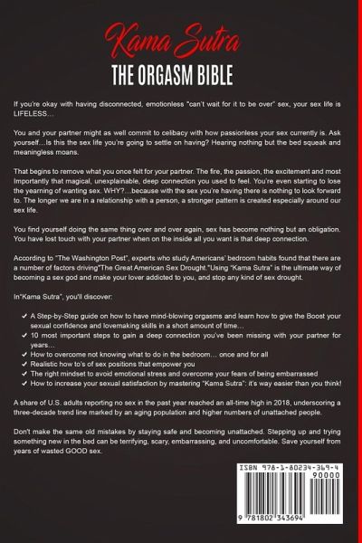 If you're okay with having disconnected, emotionless "can't wait for it to be over" sex, your sex life is LIFELESS... You and your partner might as well commit to celibacy with how passionless your sex currently is. Ask yourself...Is this the sex life you're going to settle on having? Hearing nothing but the bed squeak and meaningless moans. That begins to remove what you once felt for your partner. The fire, the passion, the excitement and most Importantly that magical, unexplainable, deep connection you used to feel. You're even starting to lose the yearning of wanting sex. WHY? ...because with the sex you're having there is nothing to look forward to. The longer we are in a relationship with a person, a stronger pattern is created especially around our sex life. You find yourself doing the same thing over and over again, sex has become nothing but an obligation. You have lost touch with your partner, when on the inside all you want is that deep connection. According to "The Washington Post", experts who study Americans' bedroom habits found that there are a number of factors driving "The Great American Sex Drought." Using "Kama Sutra" is the ultimate way of becoming a sex god and make your lover addicted to you, and stop any kind of sex drought. In "Kama Sutra", you'll discover: A Step-by-Step guide on how to have mind-blowing orgasms and learn how to give them Boost your sexual confidence and lovemaking skills in a short amount of time... 10 most important steps to gain a deep connection you've been missing with your partner for years... How to overcome not knowing what to do in the bedroom... once and for all Realistic how to's of sex positions that empower you The right mindset to avoid emotional stress and overcome your fears of being embarrassed How to increase your sexual satisfaction by mastering "Kama Sutra": it's way easier than you think! A share of U.S. adults reporting no sex in the past year reached an all-time high in 2018, underscoring a three-decade trend line marked by an aging population and higher numbers of unattached people. Don't make the same old mistakes by staying safe and becoming unattached. Stepping up and trying something new in the bed can be terrifying, scary, embarrassing, and uncomfortable. Save yourself from years of wasted GOOD sex. Buy your copy today to get the sex life you've always wanted!