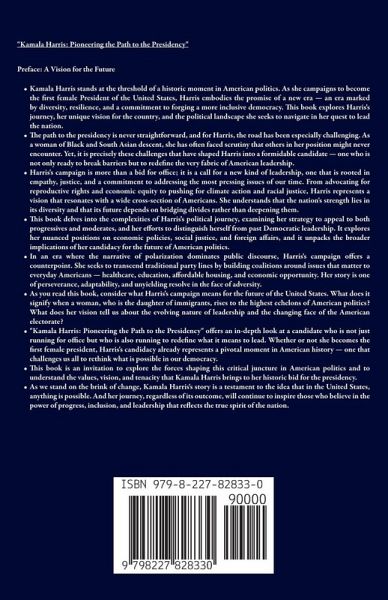 "Kamala Harris: Pioneering the Path to the Presidency" Preface: A Vision for the Future * Kamala Harris stands at the threshold of a historic moment in American politics. As she campaigns to become the first female President of the United States, Harris embodies the promise of a new era - an era marked by diversity, resilience, and a commitment to forging a more inclusive democracy. This book explores Harris's journey, her unique vision for the country, and the political landscape she seeks to navigate in her quest to lead the nation. * The path to the presidency is never straightforward, and for Harris, the road has been especially challenging. As a woman of Black and South Asian descent, she has often faced scrutiny that others in her position might never encounter. Yet, it is precisely these challenges that have shaped Harris into a formidable candidate - one who is not only ready to break barriers but to redefine the very fabric of American leadership. * Harris's campaign is more than a bid for office; it is a call for a new kind of leadership, one that is rooted in empathy, justice, and a commitment to addressing the most pressing issues of our time. From advocating for reproductive rights and economic equity to pushing for climate action and racial justice, Harris represents a vision that resonates with a wide cross-section of Americans. She understands that the nation's strength lies in its diversity and that its future depends on bridging divides rather than deepening them. * This book delves into the complexities of Harris's political journey, examining her strategy to appeal to both progressives and moderates, and her efforts to distinguish herself from past Democratic leadership. It explores her nuanced positions on economic policies, social justice, and foreign affairs, and it unpacks the broader implications of her candidacy for the future of American politics. * In an era where the narrative of polarization dominates public discourse, Harris's campaign offers a counterpoint. She seeks to transcend traditional party lines by building coalitions around issues that matter to everyday Americans - healthcare, education, affordable housing, and economic opportunity. Her story is one of perseverance, adaptability, and unyielding resolve in the face of adversity. * As you read this book, consider what Harris's campaign means for the future of the United States. What does it signify when a woman, who is the daughter of immigrants, rises to the highest echelons of American politics? What does her vision tell us about the evolving nature of leadership and the changing face of the American electorate? * "Kamala Harris: Pioneering the Path to the Presidency" offers an in-depth look at a candidate who is not just running for office but who is also running to redefine what it means to lead. Whether or not she becomes the first female president, Harris's candidacy already represents a pivotal moment in American history - one that challenges us all to rethink what is possible in our democracy. * This book is an invitation to explore the forces shaping this critical juncture in American politics and to understand the values, vision, and tenacity that Kamala Harris brings to her historic bid for the presidency. * As we stand on the brink of change, Kamala Harris's story is a testament to the idea that in the United States, anything is possible. And her journey, regardless of its outcome, will continue to inspire those who believe in the power of progress, inclusion, and leadership that reflects the true spirit of the nation.
