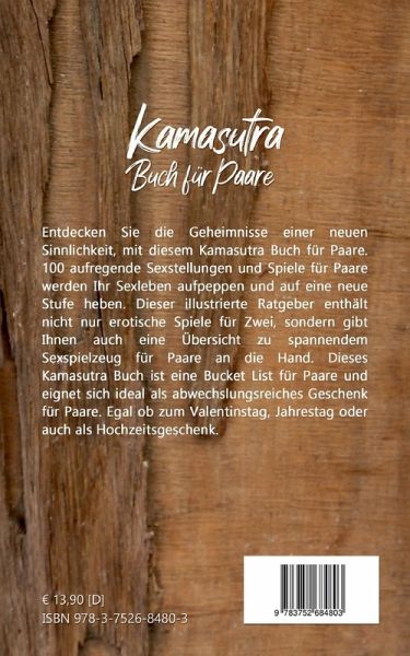 Entdecken Sie die Geheimnisse einer neuen Sinnlichkeit mit diesem Kamasutra Buch für Paare. 100 aufregende Sexstellungen und Spiele für Paare werden Ihr Sexleben aufpeppen und auf eine neue Stufe heben. Dieser illustrierte Ratgeber enthält nicht nur erotische Spiele für Zwei, sondern gibt Ihnen auch eine Übersicht zu spannendem Sexspielzeug für Paare an die Hand. Dieses Kamasutra Buch ist eine Bucket List für Paare und eignet sich ideal als abwechslungsreiches Geschenk für Paare. Egal ob zum Valentinstag, Jahrestag oder auch als Hochzeitsgeschenk.
