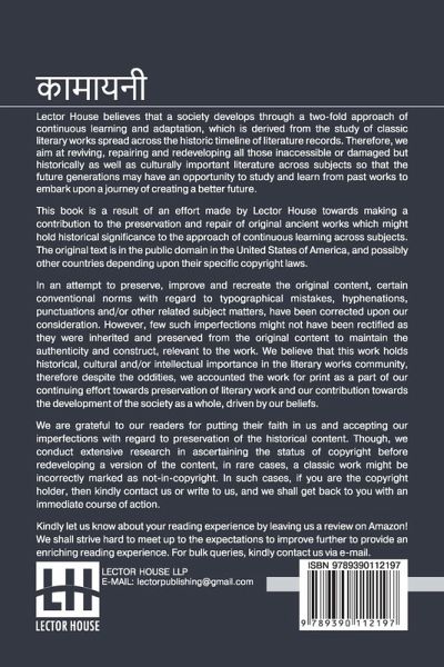Kamayani This book is a result of an effort made by us towards making a contribution to the preservation and repair of original classic literature. In an attempt to preserve, improve and recreate the original content, we have worked towards: 1. Type-setting & Reformatting: The complete work has been re-designed via professional layout, formatting and type-setting tools to re-create the same edition with rich typography, graphics, high quality images, and table elements, giving our readers the feel of holding a 'fresh and newly' reprinted and/or revised edition, as opposed to other scanned & printed (Optical Character Recognition - OCR) reproductions. 2. Correction of imperfections: As the work was re-created from the scratch, therefore, it was vetted to rectify certain conventional norms with regard to typographical mistakes, hyphenations, punctuations, blurred images, missing content/pages, and/or other related subject matters, upon our consideration. Every attempt was made to rectify the imperfections related to omitted constructs in the original edition via other references. However, a few of such imperfections which could not be rectified due to intentional\unintentional omission of content in the original edition, were inherited and preserved from the original work to maintain the authenticity and construct, relevant to the work. We believe that this work holds historical, cultural and/or intellectual importance in the literary works community, therefore despite the oddities, we accounted the work for print as a part of our continuing effort towards preservation of literary work and our contribution towards the development of the society as a whole, driven by our beliefs. We are grateful to our readers for putting their faith in us and accepting our imperfections with regard to preservation of the historical content. HAPPY READING!