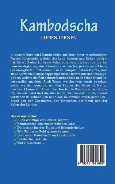 In diesem Buch wird Kambodscha aus Sicht einer reisefreudigen Person vorgestellt, welche das Land kennen und lieben gelernt hat. Es wird eine konkrete Reiseroute beschrieben, die die Sehenswürdigkeiten, die Schönheit des Landes, jedoch auch kleine Schwierigkeiten, mit denen man zu kämpfen haben könnte, darstellt. Es werden einige Tipps und wissenswerte Informationen gegeben, welche die Reise durch Kambodscha noch schöner und unvergesslich machen. Auch Tipps, welche man vorab beachten sollte, werden genannt, um den Beginn der Reise perfekt zu machen. Ebenso wird über die Geschichte Kambodschas berichtet, um das Land und die Menschen, welche dort leben, besser verstehen zu können. Ich hoffe, Sie bekommen einen guten Ein-druck von der Geschichte, den Menschen, der Natur und der Kultur des Landes.Das erwartet Sie:-Alles Wichtige vor dem Reiseantritt-Kambodscha, ein wunderschönes Land-Die besten Insider-Tipps und Besonderheiten-Wie Sie bares Geld sparen können-Die besten Unterkünfte und Restaurants-Praktische Packliste-und vieles mehr ...