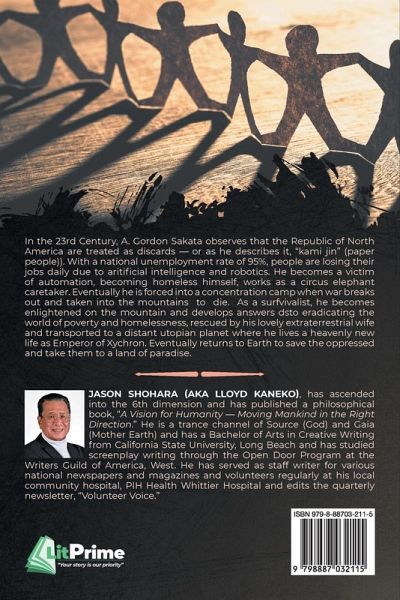 In the 23rd Century, A. Gordon Sakata observes that the Republic of North America are treated as discards -- or as he describes it, "kami jin" (paper people)). With a national unemployment rate of 95%, people are losing their jobs daily due to artificial intelligence and robotics. He becomes a victim of automation, becoming homeless himself, works as a circus elephant caretaker. Eventually he is forced into a concentration camp when war breaks out and taken into the mountains to die. As a survivalist, he becomes enlightened on the mountain and develops answers to eradicating the world of poverty 1 and homelessness, rescued by his lovely extraterrestrial wife and transported to a distant utopian planet where he lives a heavenly new life as Emperor of Xychron. Eventually returns to Earth to save the oppressed and take them to a land of paradise.
