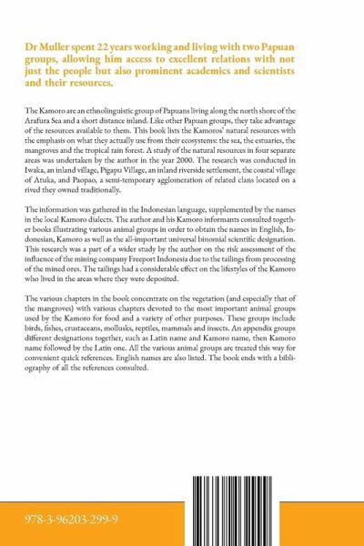 The Kamoro are an ethnolinguistic group of Papuans living along the north shore of the Arafura Sea and a short distance inland. Like other Papuan groups, they take advantage of the resources available to them. This book lists the Kamoros' natural resources with the emphasis on what they actually use from their ecosystems: the sea, the estuaries, the mangroves and the tropical rain forest. A study of the natural resources in four separate areas was undertaken by the author in the year 2000. The research was conducted in Iwaka, an inland village, Pigapu Village, an inland riverside settlement, the coastal village of Atuka, and Paopao, a semi-temporary agglomeration of related clans located on a rived they owned traditionally. The information was gathered in the Indonesian language, supplemented by the names in the local Kamoro dialects. The author and his Kamoro informants consulted together books illustrating various animal groups in order to obtain the names in English, Indonesian, Kamoro as well as the all-important universal binomial scientific designation. This research was a part of a wider study by the author on the risk assessment of the influence of the mining company Freeport Indonesia due to the tailings from processing of the mined ores. The tailings had a considerable effect on the lifestyles of the Kamoro who lived in the areas where they were deposited. The various chapters in the book concentrate on the vegetation (and especially that of the mangroves) with various chapters devoted to the most important animal groups used by the Kamoro for food and a variety of other purposes. These groups include birds, fishes, crustaceans, mollusks, reptiles, mammals and insects. An appendix groups different designations together, such as Latin name and Kamoro name, then Kamoro name followed by the Latin one. All the various animal groups are treated this way for convenient quick references. English names are also listed. The book ends with a bibliography of all the references consulted.
