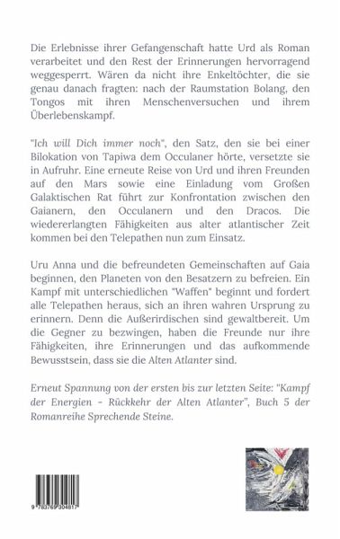 Die Erlebnisse ihrer Gefangenschaft hatte Urd als Roman verarbeitet und den Rest der Erinnerungen hervorragend weggesperrt. Wären da nicht ihre Enkeltöchter, die sie genau danach fragten: nach der Raumstation Bolang, den Tongos mit ihren Menschenversuchen und ihrem Überlebenskampf. "Ich will Dich immer noch", den Satz, den sie bei einer Bilokation von Tapiwa dem Occulaner hörte, versetzte sie in Aufruhr. Eine erneute Reise von Urd und ihren Freunden auf den Mars sowie eine Einladung vom Großen Galaktischen Rat führt zur Konfrontation zwischen den Gaianern, den Occulanern und den Dracos. Die wiedererlangten Fähigkeiten aus alter atlantischer Zeit kommen bei den Telepathen nun zum Einsatz. Uru Anna und die befreundeten Gemeinschaften auf Gaia beginnen, den Planeten von den Besatzern zu befreien. Ein Kampf mit unterschiedlichen "Waffen" beginnt und fordert alle Telepathen heraus, sich an ihren wahren Ursprung zu erinnern. Denn die Außerirdischen sind gewaltbereit. Um die Gegner zu bezwingen, haben die Freunde nur ihre Fähigkeiten, ihre Erinnerungen und das aufkommende Bewusstsein, dass sie die Alten Atlanter sind. Erneut Spannung von der ersten bis zur letzten Seite: "Kampf der Energien - Rückkehr der Alten Atlanter", Buch 5 der Romanreihe Sprechende Steine.