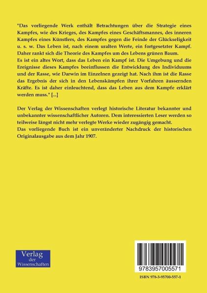"Das vorliegende Werk enthält Betrachtungen über die Strategie eines Kampfes, wie des Krieges, des Kampfes eines Geschäftsmannes, des inneren Kampfes eines Künstlers, des Kampfes gegen die Feinde der Glückseligkeit u. s. w. Das Leben ist, nach einem uralten Werte, ein fortgesetzter Kampf. Daher rankt sich die Theorie des Kampfes um des Lebens grünen Baum.