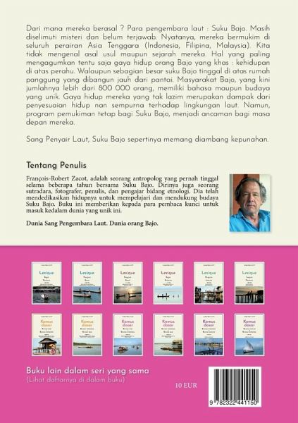 Dari mana mereka berasal ? Para pengembara laut : Suku Bajo. Masih diselimuti misteri dan belum terjawab. Nyatanya, mereka bermukim di seluruh perairan Asia Tenggara (Indonesia, Filipina, Malaysia). Kita tidak mengenal asal usul maupun sejarah mereka. Hal yang paling mengagumkan tentu saja gaya hidup orang Bajo yang khas : kehidupan di atas perahu. Walaupun sebagian besar suku Bajo tinggal di atas rumah panggung yang dibangun jauh dari pantai. Masyarakat Bajo, yang kini jumlahnya lebih dari 800 000 orang, memiliki bahasa maupun budaya yang unik. Gaya hidup mereka yang tak lazim merupakan dampak dari penyesuaian hidup nan sempurna terhadap lingkungan laut. Namun, program pemukiman tetap bagi Suku Bajo, menjadi ancaman bagi masa depan mereka. Sang Penyair Laut, Suku Bajo sepertinya memang diambang kepunahan.12 Lexiques des langues Badjo (Indonésie), Sangihe (Indonésie), Français12 Kamus dasar bahasa Bajo (Indonesia), Sangihe (Indonesia), Perancis 12 dictionaries in 3 languages: Badjo (Indonesia), Sangihe (Indonesia), French